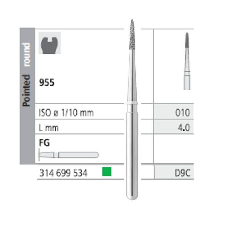 Fresas Diamante FG D9C Cono Puntiagudo Corto, Redondo, Cuello Largo 955-010 Grueso L4mm 6 uds Intensiv