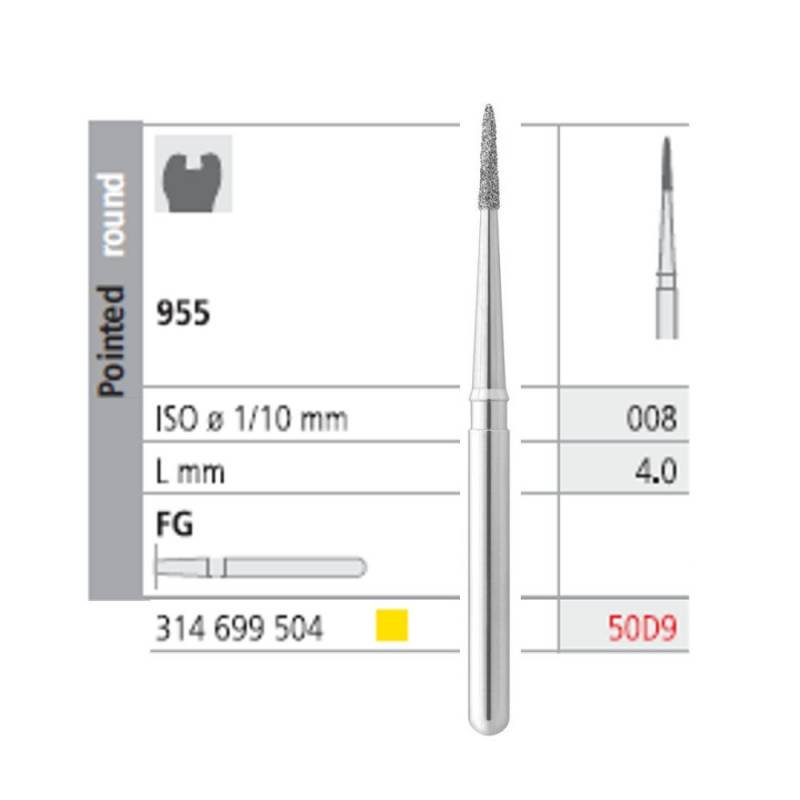 Fresas Diamante FG 50D9 Cono Puntiagudo Corto, Redondo, Cuello Largo 955-008 Extra Fino L4mm 6 uds Intensiv