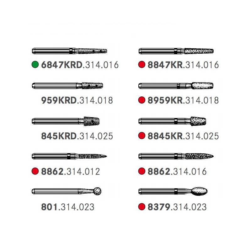 - 6847KRD.314.016 - fresa diamantada de grano grueso con forma cónica. Marcas de profundidad de 2 y 4mm. Diámetro más ancho parte activa 1,6mm.