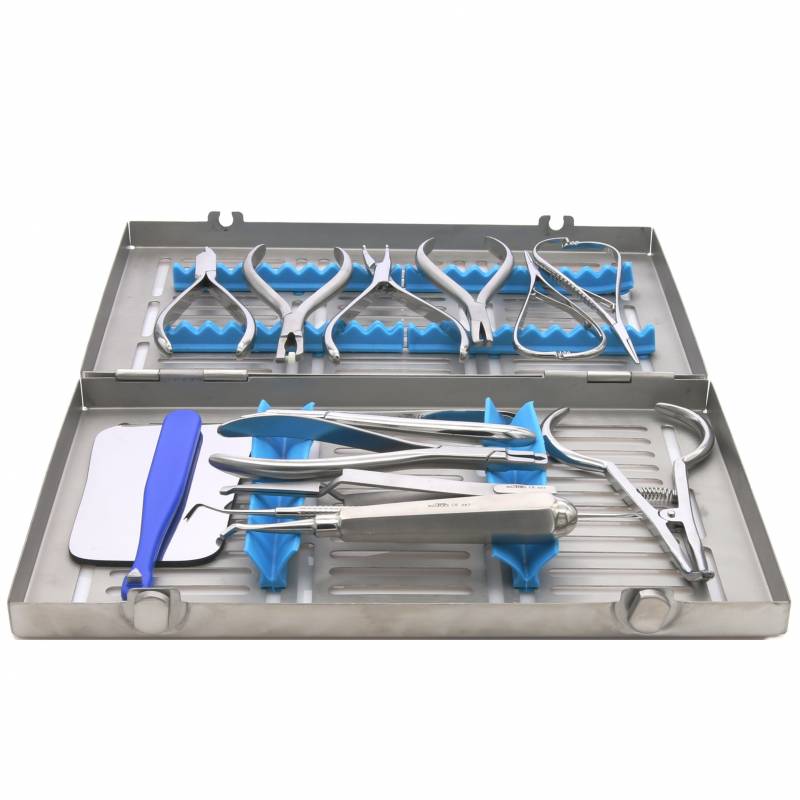 Set de Ortodoncia compuesto por 14 instrumentos imprescindibles para tratamientos de ortodoncia, junto con una caja de esterilización con capacidad de 20 instrumentos.