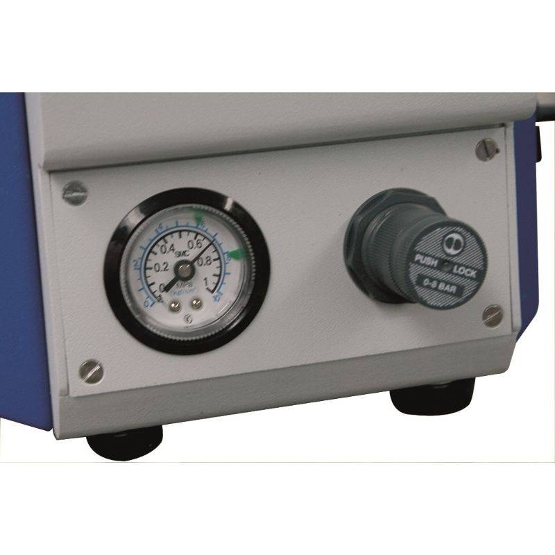 La inyectora de poliamidas dentales Mestra cuenta con regulador de presión y de manómetro.