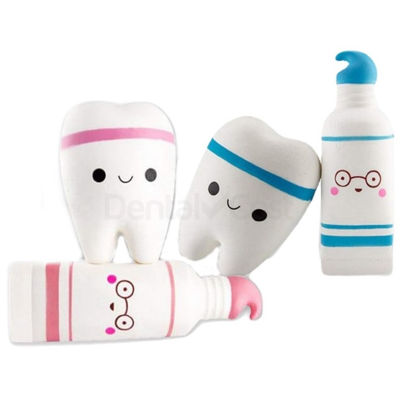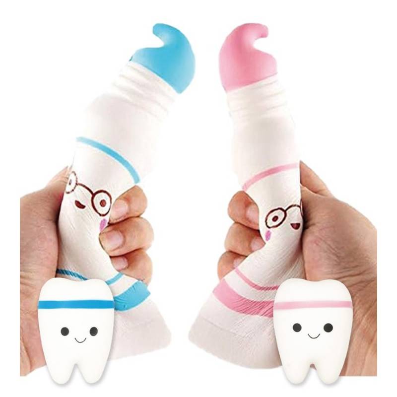 Con forma de tubos de pasta de dientes y molares, son juguetes de compresión relajantes que ayudan al paciente reduciendo el nivel de estrés y ansiedad apretando y relajando el juguete en la mano.