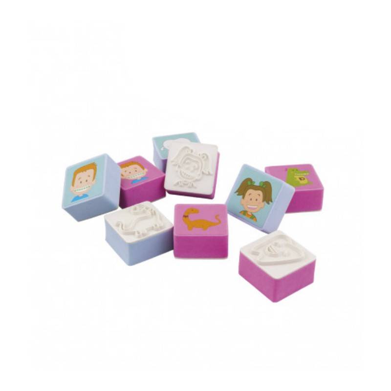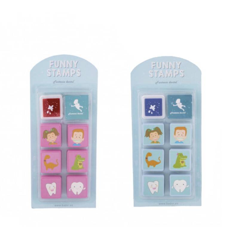 - Simpático juego de sellos con tinta de los personajes de Fantasía Dental.