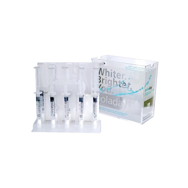 Se trata de un kit de 10 jeringas del blanqueador, en 2 concentraciones a elegir de peróxido de carbamida: 10% ó 16%.
