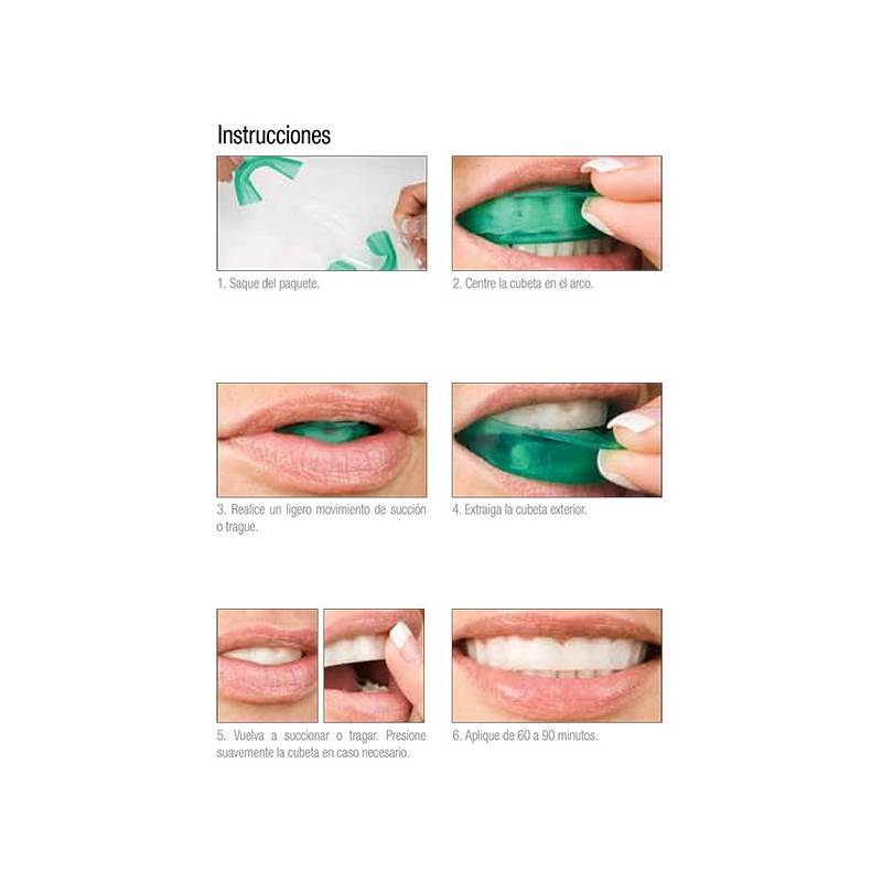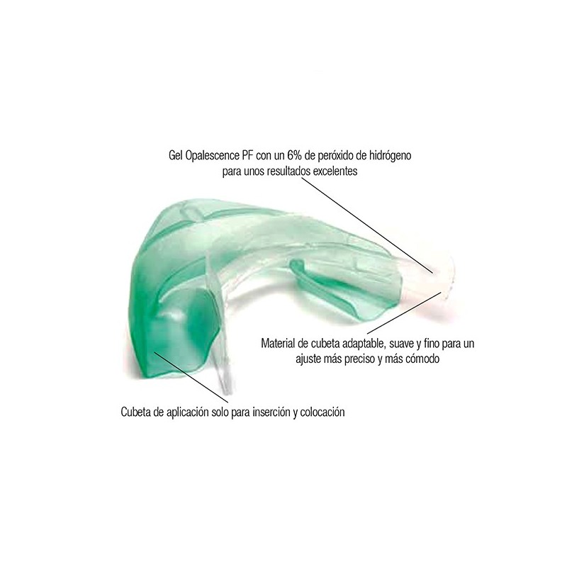 El gel de blanqueamiento Opalescence Go 6% contiene nitrato de potasio y fluoruro para reducir la sensibilidad y proteger contra la caries. Además, el material de las cubetas es fino y muy confortable para el paciente.