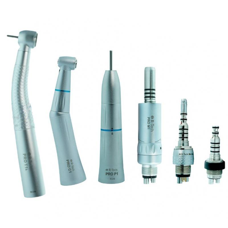 El kit de instrumental rotatorio de R-Tech Pro T Quick LED + Acople sin Luz cuenta con: turbina, pieza de mano, contraángulo, micromotor, acople LED y acople sin luz: