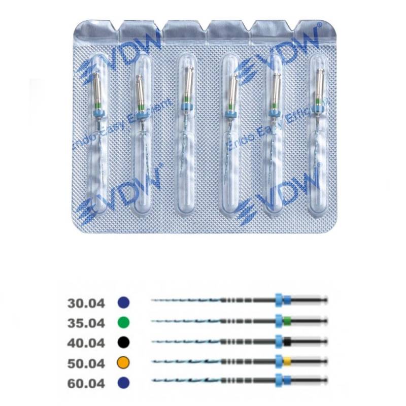 El envase de limas rotatorias VDW.Rotate modelado de anatomías de canales grandes contiene 1 blister de 6 unidades, a elegir.
