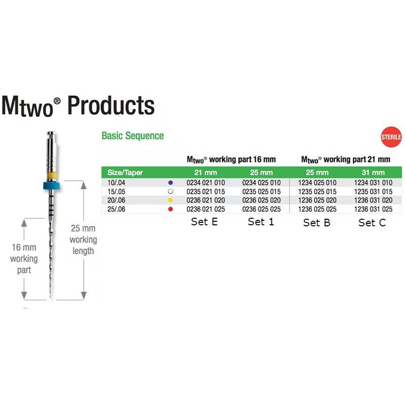 Cada set de limas MTWO Secuencia Básica contienen el siguiente surtido de tamaños y conicidades: 10/.04 - 15/.05 - 20/.06 - 25/.06