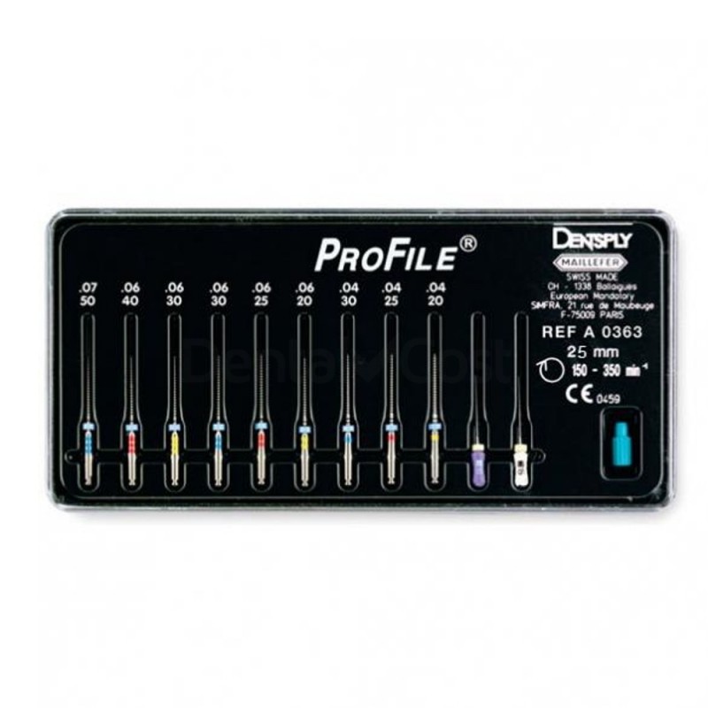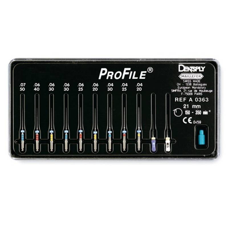 La lima Profile de Maillefer es un instrumento rotatorio fabricado con una aleación Níquel-Titanio. Su gran flexibilidad permite conformar el conducto delicadamente, sobre todo a nivel apical.