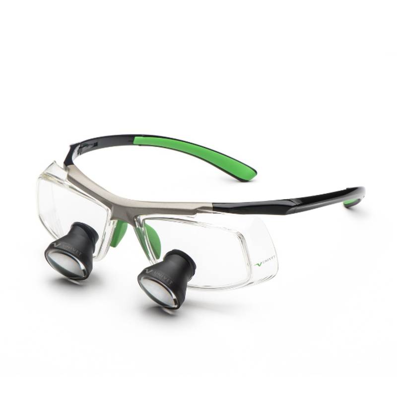 La lupa binocular Galileanas TTL PRO 2.5x 400 Techne RX Black Green de Univet para clínicas dentales ayudan a prevenir la fatiga visual y la tensión en hombros y cuello cuando se realizan procedimientos de gran precisión visual.