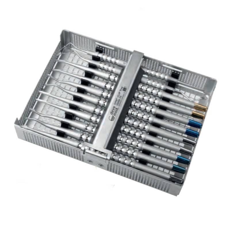 Este set contiene instrumentos con mango RS, redondo y sólido, que ofrece una transmisión de la potencia mejorada y con mayor control y mango SL, ultraligeros. Ambos permitiendo un trabajo táctil sin dañar las estructuras adyacentes.