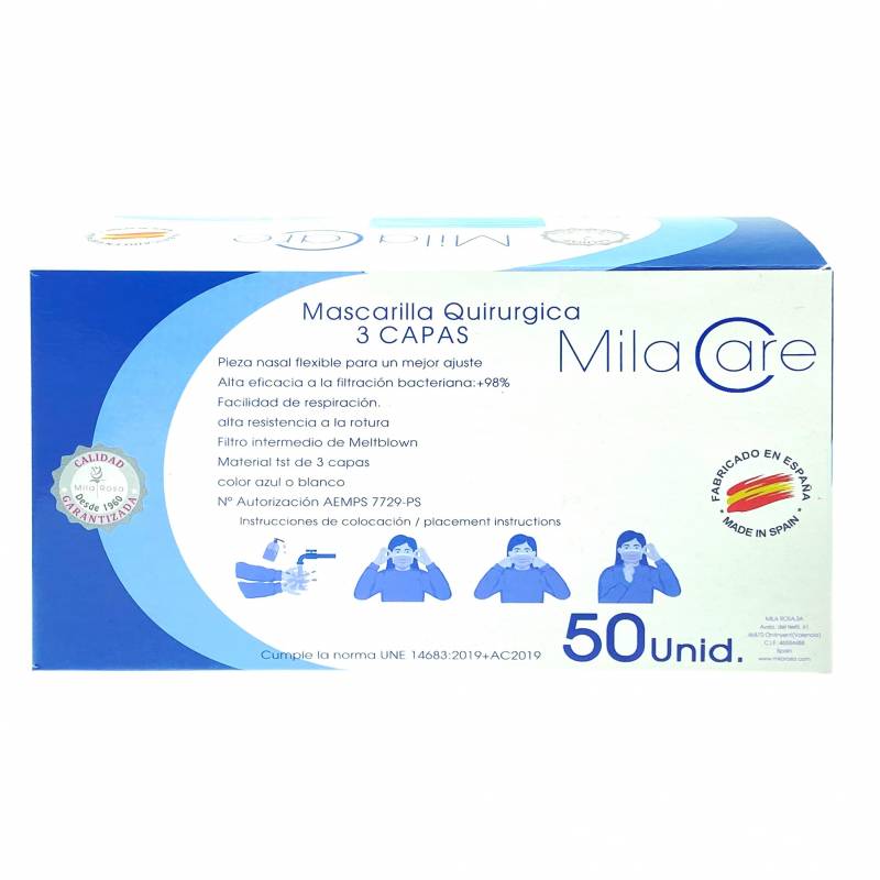 Mascarillas Quirúrgicas de MilaCare de triple capa con porcentaje de filtración ≧99%. Talla adulto.