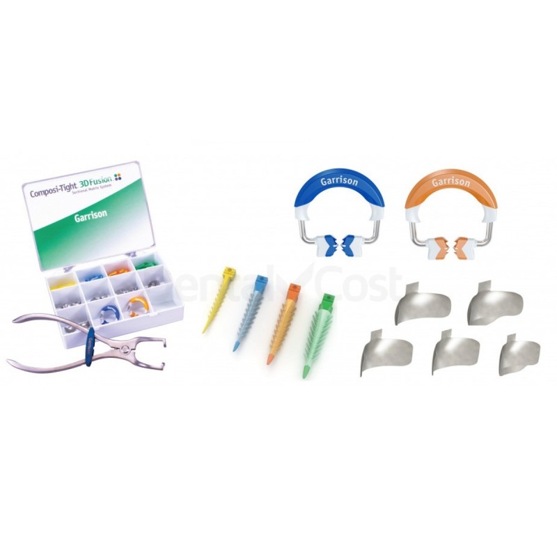 Mini kit Composi-Tight 3D Fusion Matrix System contiene: 1 anillo FX400, 1 anillo FX500, 40 bandas Firm (10 de FXH100, FXH175, FXH200, 5 de FXH150, FXH300), 40 cuñas de fusión (10 de cada una), 1 FXP01