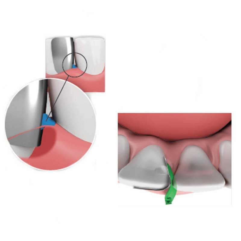 Gracias a su forma de ''T'' se colocan más profundamente en el espacio interproximal para reducir el ''triángulo negro'' o ''troneras''.