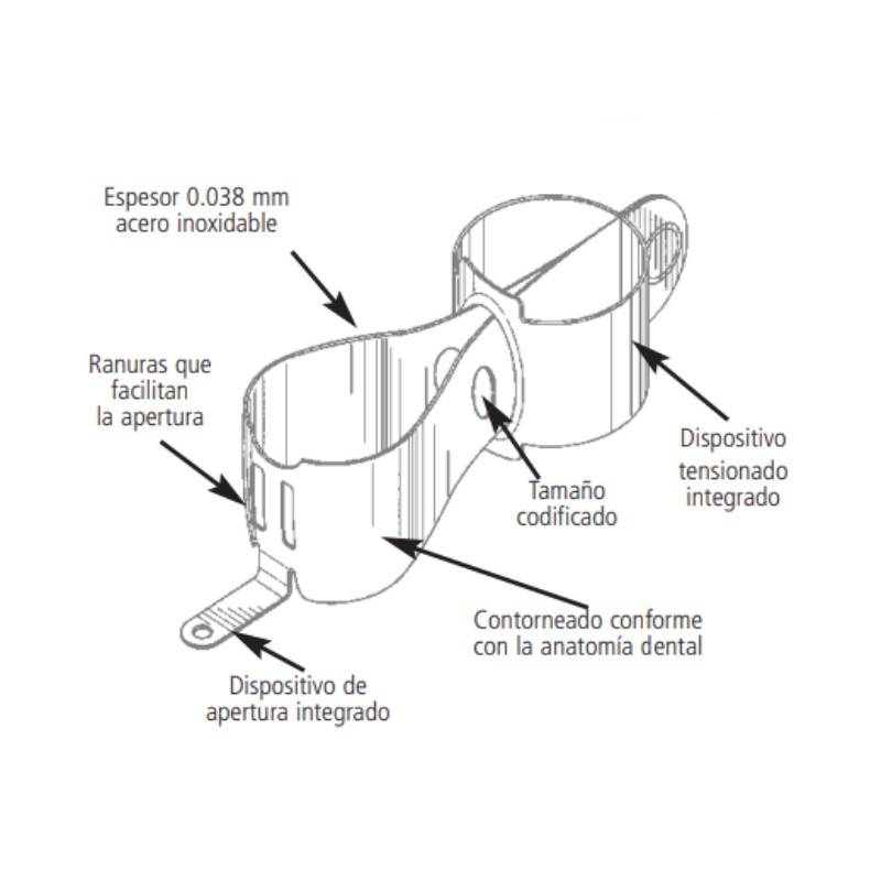 La banda matriz de 0,038 mm permite una colocación estable y sin distorsión por medio de puntos de contactos ajustados. Todo ello, gracias a su forma contorneada que facilita un perfecto control. Además, no presenta protuberancias y no precisa de mucho acabado.