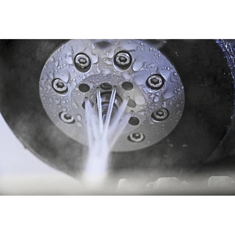 Cuenta con el sistema de refrigeración totalmente integrado, incluida bomba y filtro. El líquido refrigerante pasa por ocho boquillas hasta llegar a la herramienta que es enfriada de forma uniforme desde la punta hasta el vástago durante todo el mecanizado.