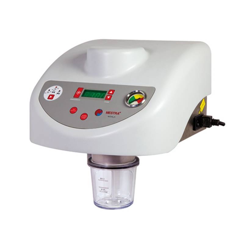 La mezcladora Mestra Koala está dotada de un potente y robusto motorreductor con engranajes de nylon (menor ruido y fricción) y de una bomba de alto vacío de dos cuerpos.