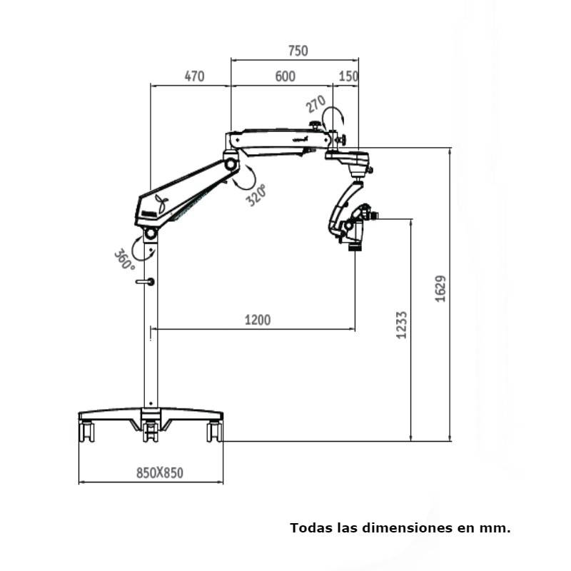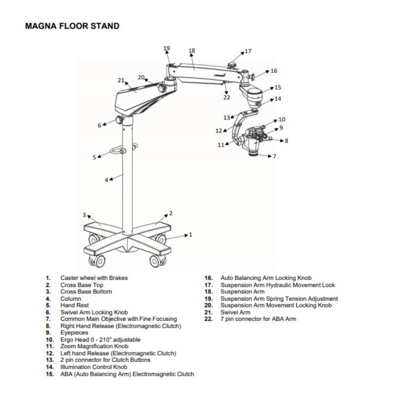 - Brazo y porta microscopio: ABA (Brazo de Balance Automático) con liberación electromagnética para un posicionamiento fácil y libre de desviaciones.