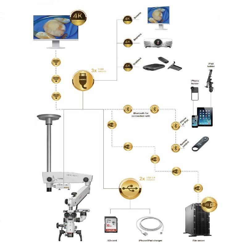 Con salida USB de la cámara en el brazo del microscopio y sistema bluetooth y wifi.