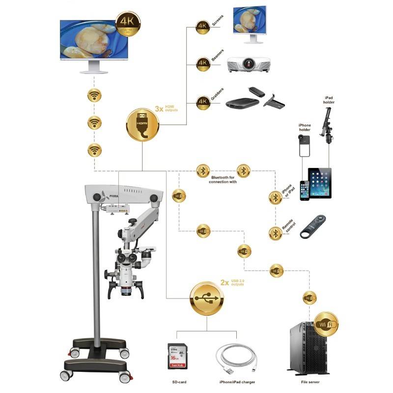 Con salida USB de la cámara en el brazo del microscopio y sistema bluetooth y wifi.