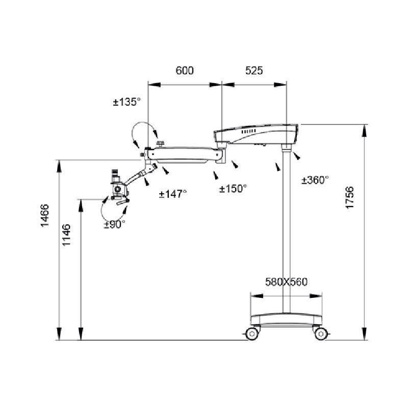 El microscopio dental Prima DNT Premium Nuvar 20 Labomed con base robusta con forma de H, presenta un sistema de montaje móvil sobre ruedas giratorias con sistema de bloqueo.