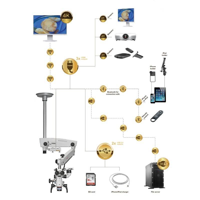 Con salida USB de la cámara en el brazo del microscopio y sistema bluetooth y wifi.
