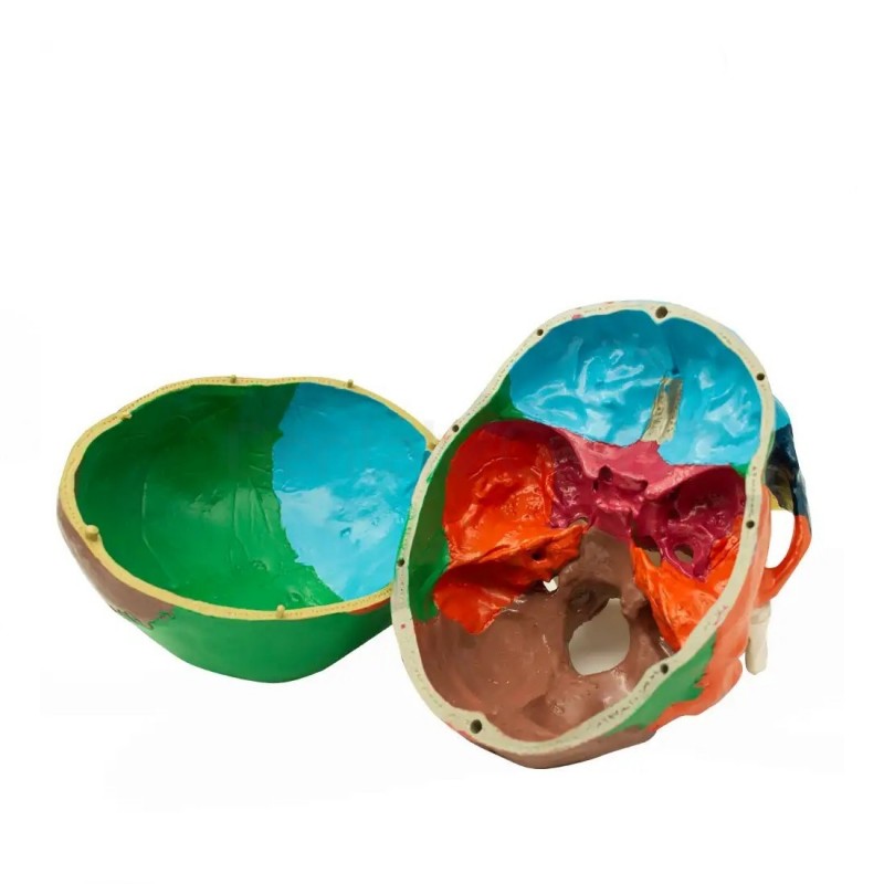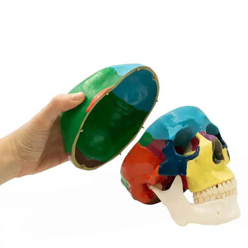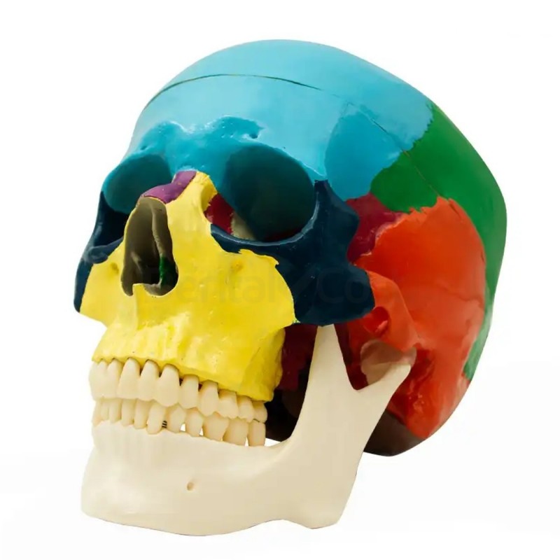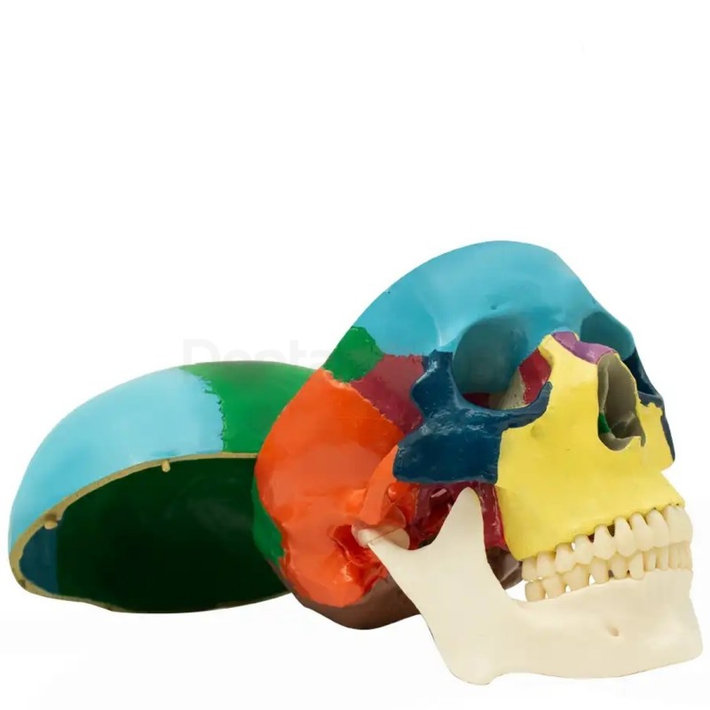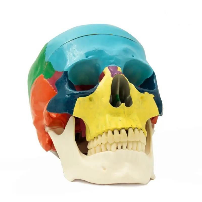 El cráneo humano anatómico de Bader Dental presenta diferentes colores para distinguir claramente los huesos del cráneo y la cara. La codificación visual facilita la identificación y el estudio de cada estructura ósea, de esta forma ayuda a los estudiantes a memorizar y comprender la compleja anatomía craneofacial.