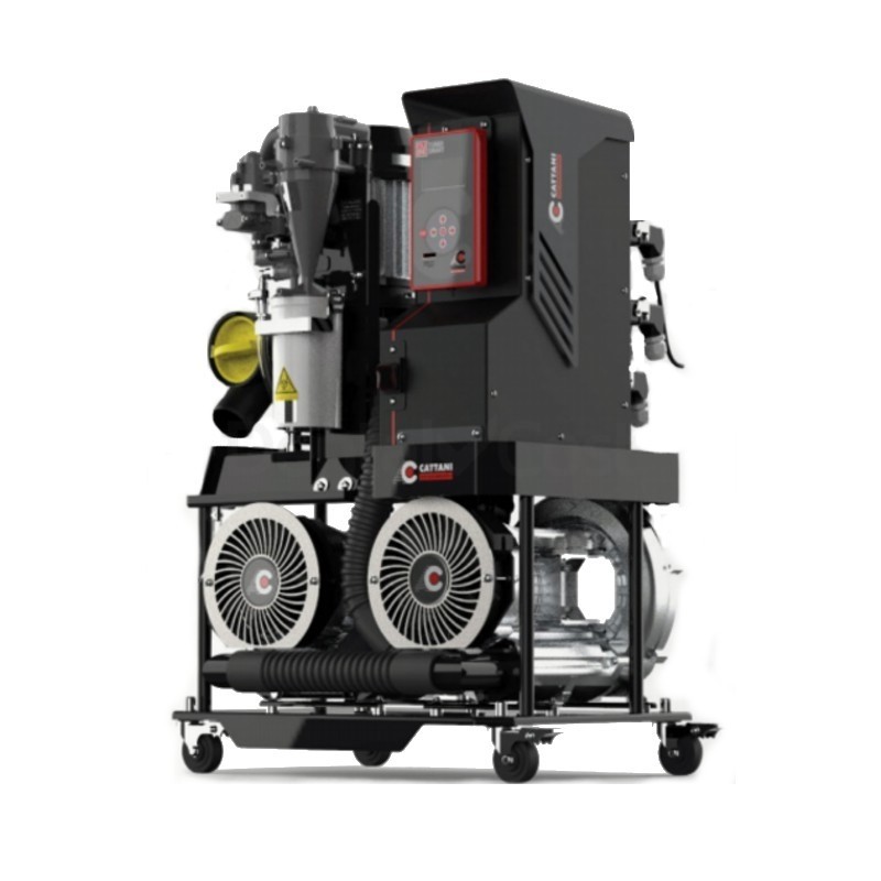 Diseñado por Cattani, este sistema con presión elevada de 340 mbar garantiza un sistema de aspiración dinámico y flexible a través de tuberías de diámetro reducido, o con sifones o sillones muy separados del cuarto de máquinas, ya que en esa presión de entre 170 y 200 mbar en esa disposición no sería suficiente.