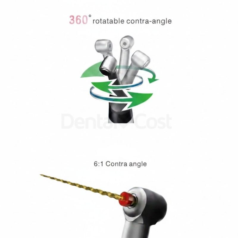 El contraángulo inalámbrico permite un trabajo cómodo y de fácil acceso a diferentes piezas dentales gracias a su ángulo de trabajo ajustable, giro 360º.