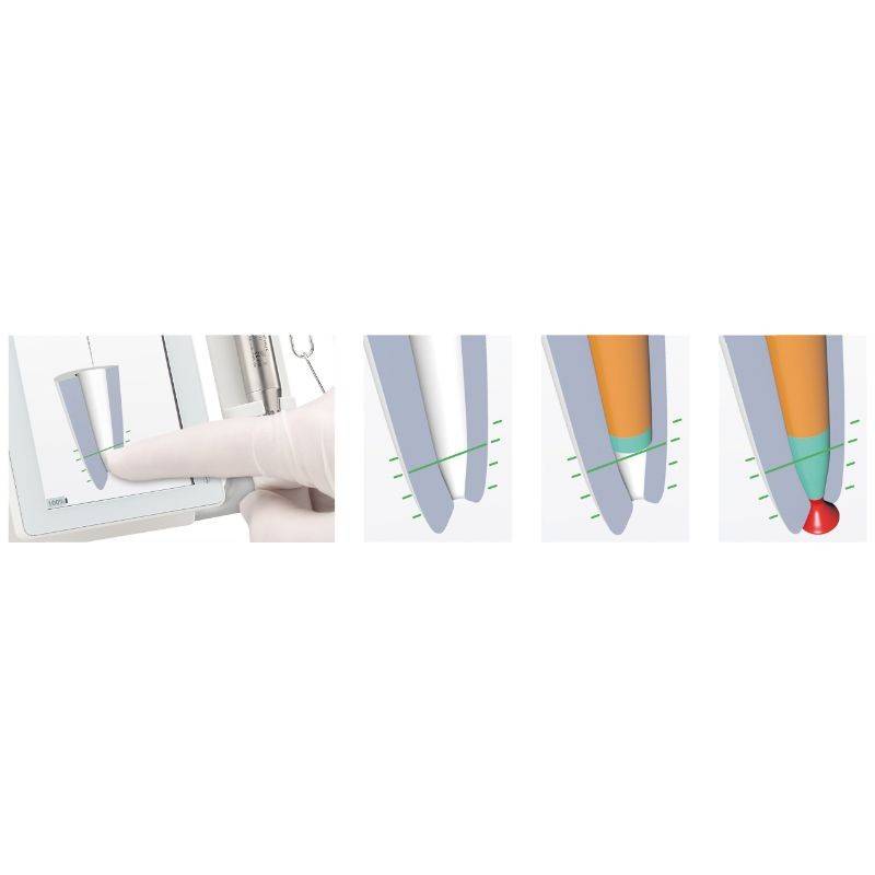 El localizador de ápices integrado permite determinar de forma precisa y en tiempo real la longitud, pudiendo el profesional controlar en todo momento la posición de la lima. Este dispositivo se puede usar sin el motor endodóntico para determinar la longitud durante la preparación con limas manuales y clips para limas.