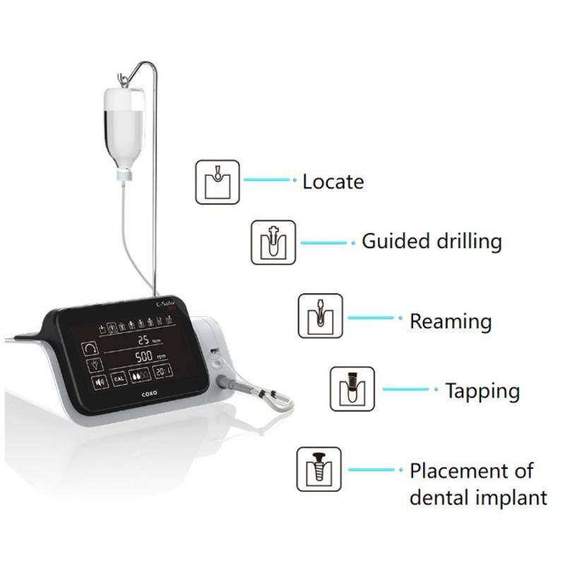 El motor de implantes Coxo C Sailor Pro es sencillo de manejar, ya que cuenta con una unidad de sobremesa con una gran pantalla totalmente táctil donde se visualizan por gráficos el proceso de implantación: localizar - fresado guiado - escariado - roscado - colocación de implante dental.