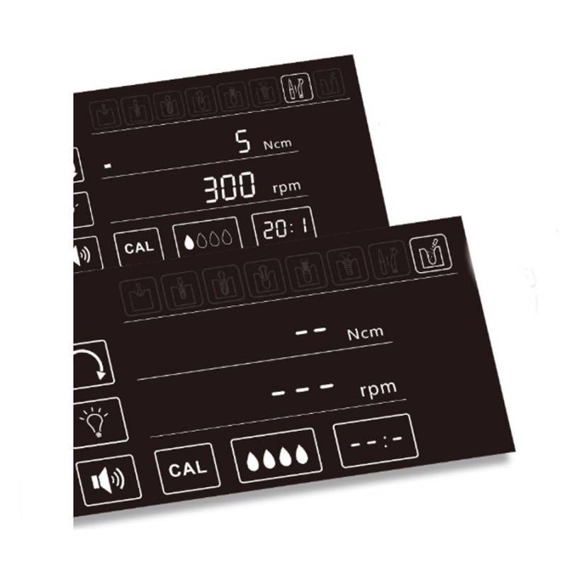 - Función de enjuague: Alimente líquido y encienda la iluminación de la pieza de mano. El motor no se activa durante este proceso.