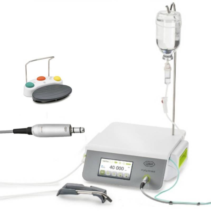 El equipo de implantes Implantmed Plus SI-1023 de W&H incluye, además de la unidad de control, el micromotor EM-19 LC con luz y el pedal de control inalámbrico S-NW.