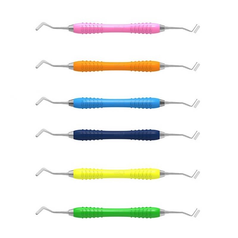 Mango de silicona termoestable y antideslizante de núcleo de acero inoxidable muy ligero y sellado antibacteriano. Se presentan codificados por color para permitir una fácil identificación entre los instrumentos.