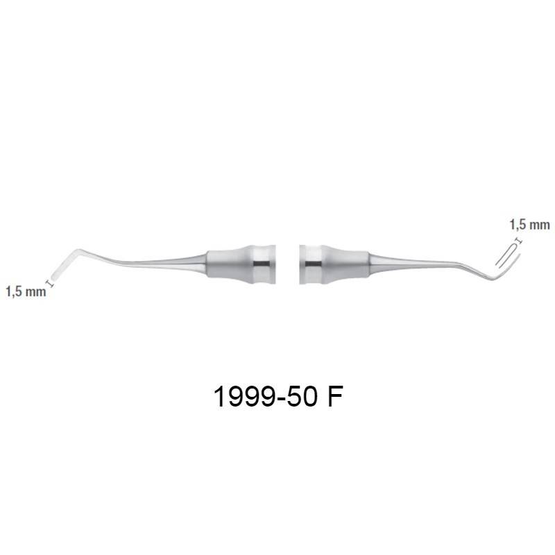 - 1999-50 F - ECI Instrumento composite para restauraciones estéticas - espátula, distal - Doble parte activa: 1,5 / 1,5 mm. - Este instrumento delicado y flexible y espatulado se emplea para bruñir y tallar en áreas proximales de difícil acceso.