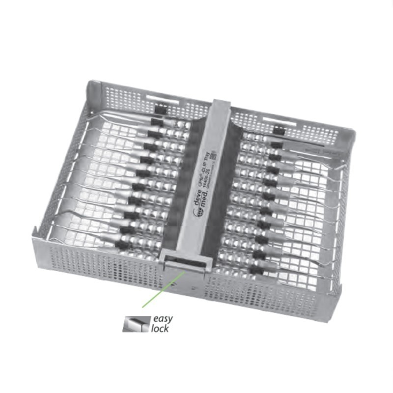 Todo presentado en una bandeja de esterilización 9200-80 GPM. Fabricada en acero inoxidable con tiras de silicona para una firme sujeción de los instrumentos durante el lavado o almacenamiento. Sus grandes perforaciones garantizan una limpieza eficaz. Medidas: 177,5 x 127,5 x 33,0 mm.