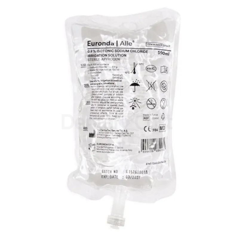 El suero fisiológico de Euronda Alle Dental de cloruro de sodio 0,9% es una solución isotónica estéril adecuada para la irrigación de las áreas quirúrgicas mientras se enfrían instrumentos rotatorios durante operaciones o instrumentos oscilantes durante cirugía piezoeléctrica.