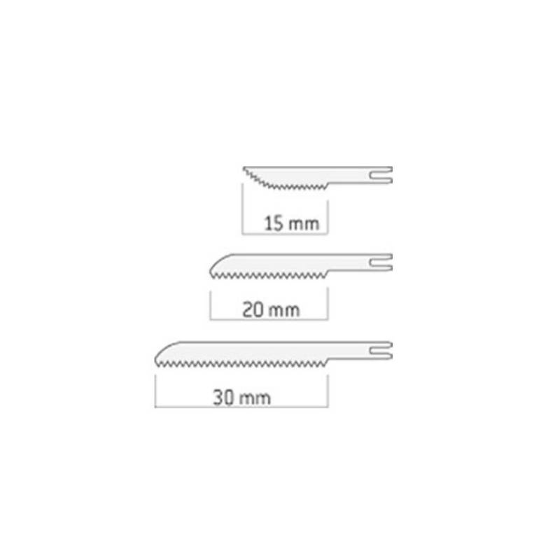 Con 6 hojas de sierra (2 de 15 mm, 2 de 20 mm y 2 de 30 mm de largo), triscadas para un mayor rendimiento de corte.