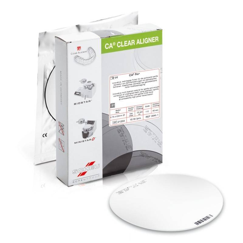 Las láminas alineadoras CA Pro Clear Aligner de Scheu Dental son de un material termoplástico, biocompatible y de alta calidad.