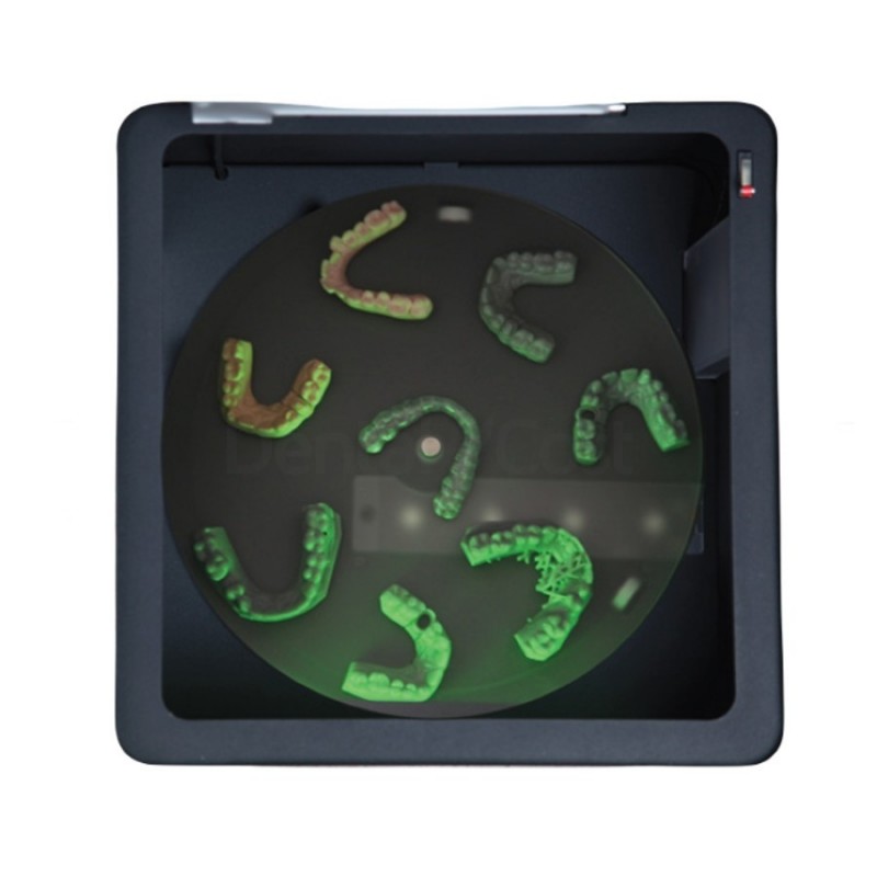 Con una longitud de onda de luz ultravioleta comprendido entre los 375 - 405 nanómetros es capaz de fotopolimerizar la mayoría de los materiales dentales empleados: modelos creados con impresoras 3D, así como compuestos y cubetas individuales fotopolimerizables.