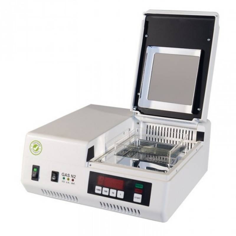 Especialmente indicada para aplicaciones dentales, otoplásticos y joyería gracias a que sus dos flashes emiten luz desde abajo hacia la cámara de polimerización y reducen considerablemente los tiempos de polimerización.