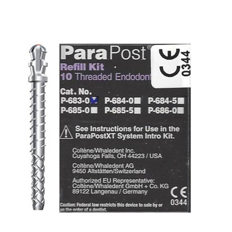 La caja reposición de pernos roscados ParaPost XT titanio de Coltène contiene 10 unidades a elegir tamaño entre los disponibles.