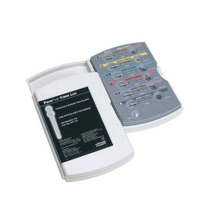 El kit intro ParaPost Fiber Lux de Coltène contiene 15 pernos en diferentes tamaños + brocas ParaPost estándar.