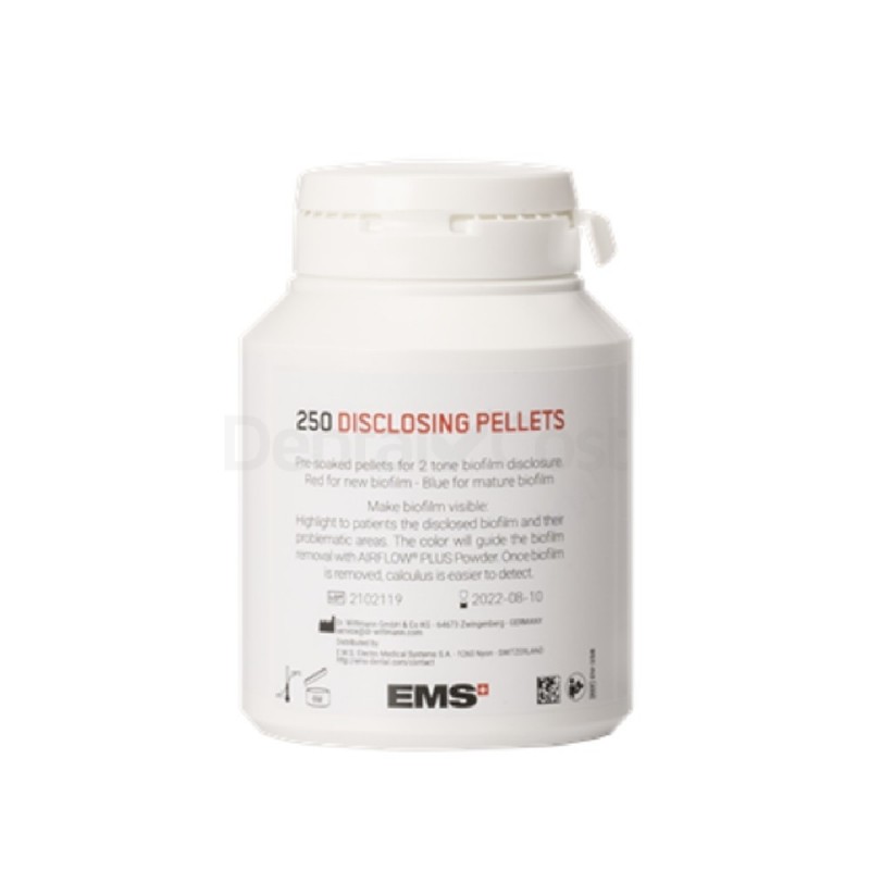 El bote del detector de placa Biofilm Discloser de EMS Dental contiene 250 pellets prehumedecidos .