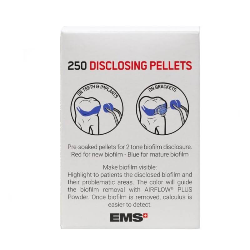 Biofilm Disclose de EMS Dental son unos pellets prehumedecidos con un revelador para detectar el biofilm en 2 tonos: rojizo para identificar el biofilm blando y nuevo y azul para el biofilm viejo y duro.