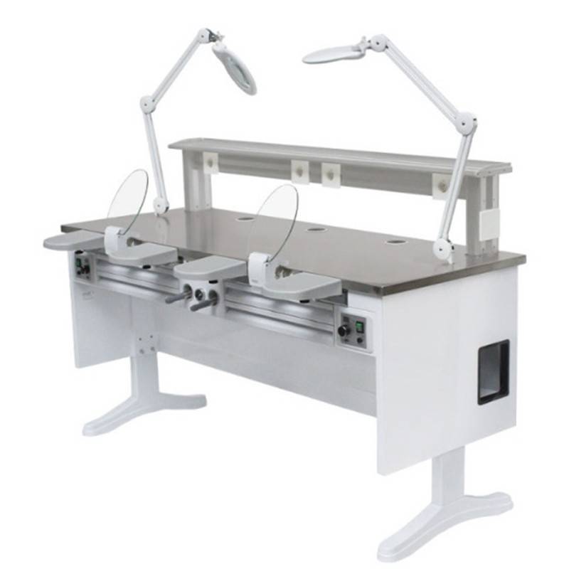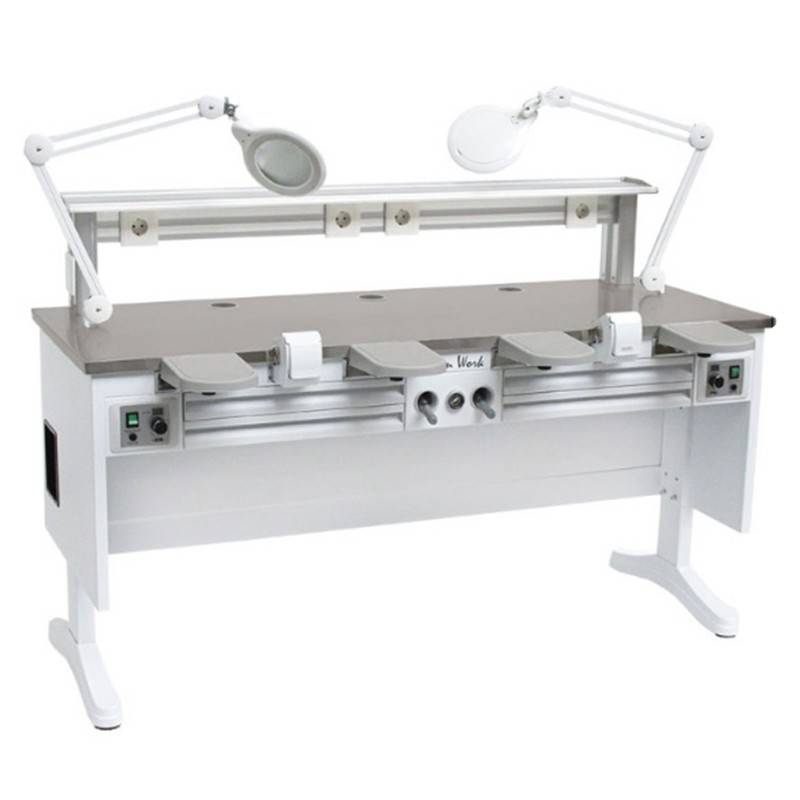 El doble puesto Max Work Twin de Bader es una mesa de trabajo para 2 personas para laboratorio protésico dental fabricada con bastidor en acero recubierto con pintura epoxi y con encimera de acero inoxidable AISI 316.