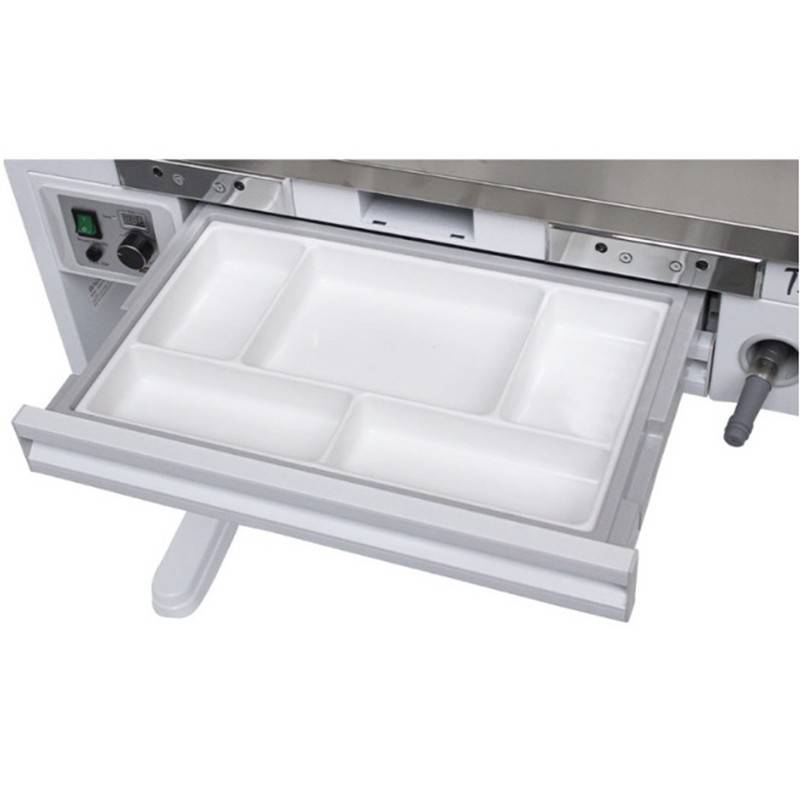 Con soplador de aire retráctil, manómetro de presión y panel de control de aspiración digital con conexión usb, interruptores (on/off, luz, etc) y enchufes europeos tipo SCHUKO standard ISO, todo ello independiente para cada puesto.
