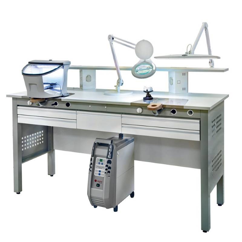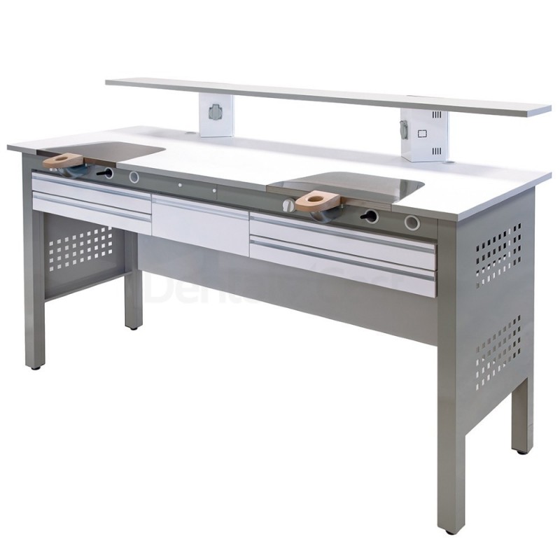 La mesa de trabajo Mestra cuenta con los accesorios y elementos necesarios para realizar trabajos en entornos dentales tales como: enchufes, repisa, cajones, doble mantel-sufridera de trabajo en acero inoxidable, sopladores de aire, etc.