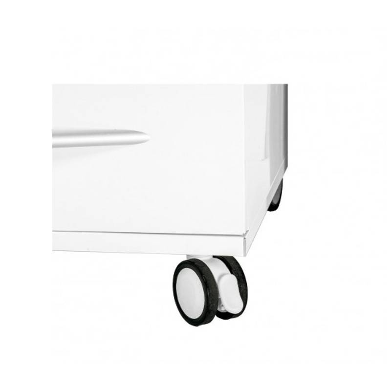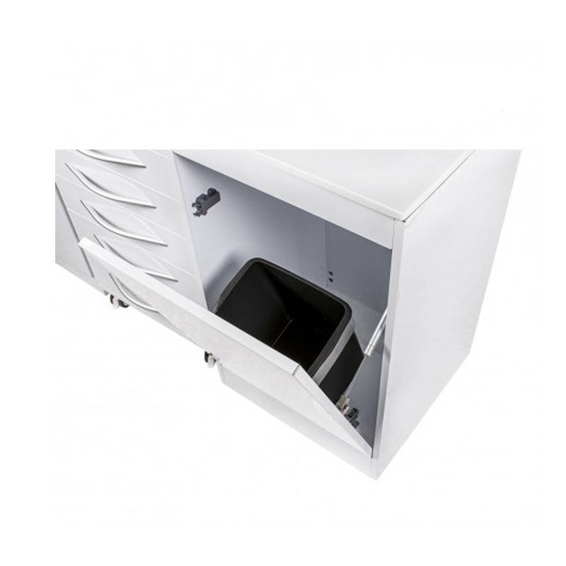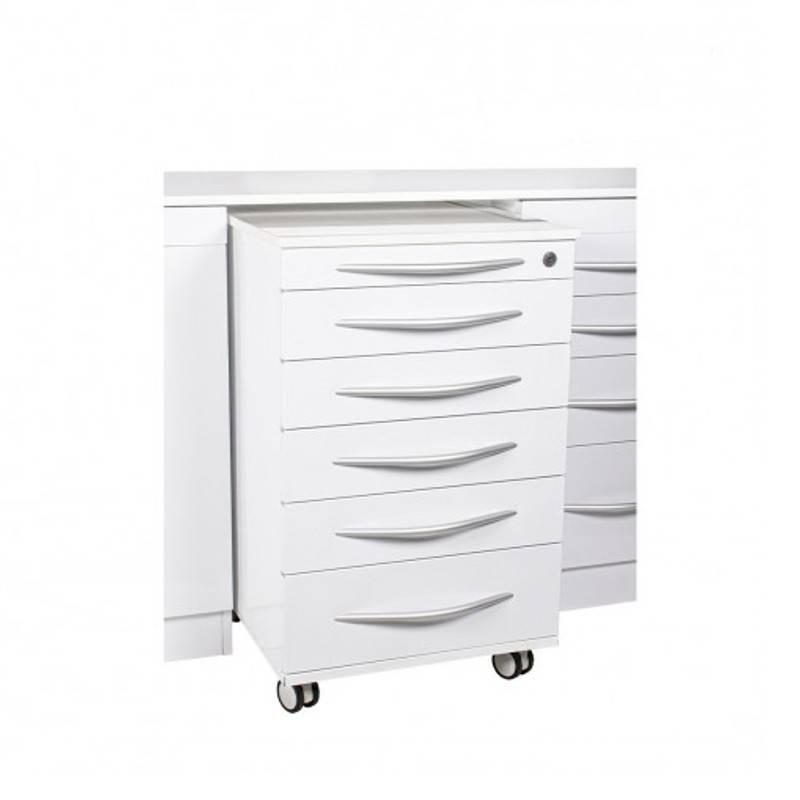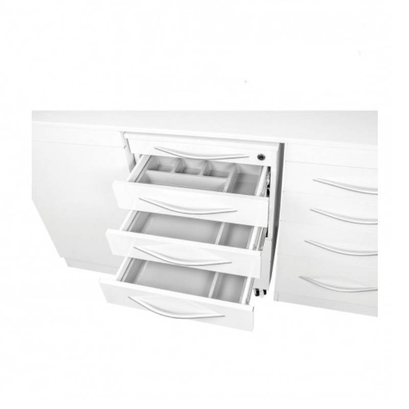 - carrito móvil compuesto por 5 cajones, 3 de ellos contienen bandejas profesionales. Sus ruedas son altamente resistentes y de corretaje fluido con autobloqueo, que permiten el traslado y fijación de la mesa.