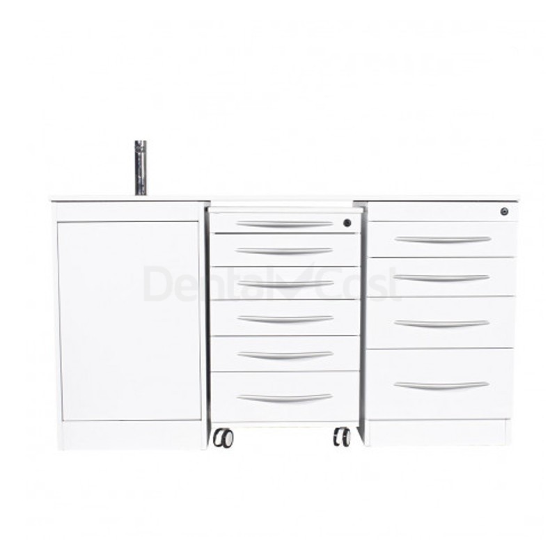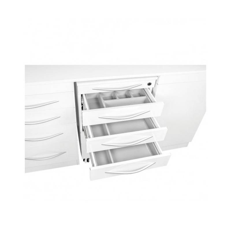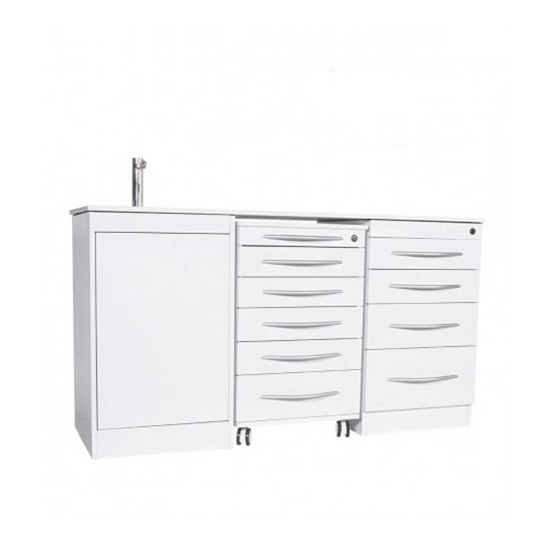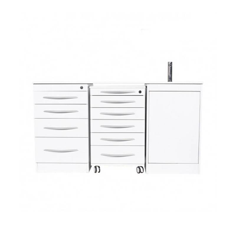 Este conjunto de mobiliario de atractiva estética, está diseñado con materiales resistentes al agua y fáciles de limpiar que resisten el trabajo diario de una consulta dental.
